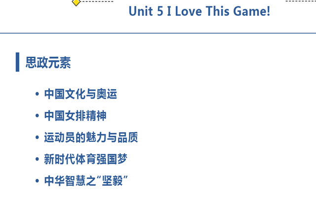 设计中引入北京2022年冬奥会申办宣传片,巧妙地将冰雪运动的精彩瞬间与中国文化、城市景观完美融合,展现独一无二的冬奥体验;50种奥林匹克动态图标项目,用简洁的图片巧妙地传达运动特点,将运动员充满活力的姿态展现得栩栩如生;教师在教学中可组织学生竞猜图标中所指代的运动项目,让学生了解奥运会运动项目及英文表达;女排精神是中国体育精神最生动的诠释。中国的奥运之路,亦是伟大复兴之路。“祖国至上、团结协作、顽强拼搏、永不言败”的女排精神历久弥新、代代相传,极大地激发了中国人的民族自豪感与文化自信心;以此话题的讨论可以让学生深刻体会新时代女排精神中所蕴含的团结协作精神和爱国主义情怀;头脑风暴中教师可以引导学生树立职场协作的意识;拓展部分让学生思考中国体育未来会怎样?体育强国的美好愿景。在全面健身已经成为社会新风潮的当下,教师可为学生阐释体育强国梦的核心理念,引领学生认识到体育锻炼对国家长远发展的重要性。同时可以发散思维,思考自身能够为建设新时代体育强国梦做些什么。引导学生畅所欲言,展望未来的奥运之路。