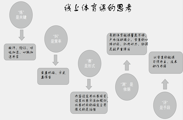 本次疫情对高校的学生日常管理工作提出了较高的要求,体育课程由线下转到线上可能是一个长期的过程,体育课程与其他课程相比,在线上教学资源、教授内容、教授方式等方面上经验尚缺。王维朋老师与大家共同探讨了怎样开展线上体育教学,提出线下体育课、体育活动、体育比赛的特性应该贯穿在线上教学过程中:1、“练”是关键。微汗、脸红、呼吸加速、心跳加速为宜。2、“纠”是策略。指令需要明确、练习方式要得当。3、“赛”是形式。内容设定为比赛项目、设置比赛方法和规则,比赛时间的确定上有很大的灵活性。4、“测”是依据。长期体育锻炼量度不够、户外活动减少,学生的心肺功能、肌肉耐力、协调灵敏严重滞后。5、“评”是手段。以学生的锻炼习惯为主、技术动作为辅。他还建议将网络平台资源运用到体育教学中(例如:乐运动、跳绳、Keep等运动软件)以及线上体育课的课程建设(线上课程资源,线上教学评价体系等)。会上大家积极研讨,于宇老师分享了在线上体育教学中遇到的困难,俞晓蕾老师分享了在线上体育教学中运用的方法与使用的线上平台。