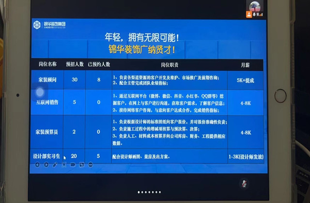 为了更好地扩宽毕业生就业渠道,2022年5月30号下午14:00,江苏锦华建筑装饰设计工程股份有限公司在思学楼308举办了线上招聘宣讲会。