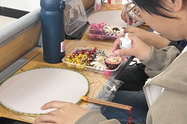 10月19日活动现场,人文社科系学生会给前来参加活动的同学准备了空白团扇、花材、胶水等材料和工具,人文社科系学生会主席杨闪悦和副主席马绍华一起给大家分发活动所需的材料,经过一系列的了解和学习,同学们充分发挥创意和想象力,用干花在团扇中任意搭配各种图案,并用胶水小心翼翼地粘住,固定好干花在团扇中的位置,大家相互观摩,一幅幅清新淡雅的团扇作品在每位同学的巧手下诞生了。