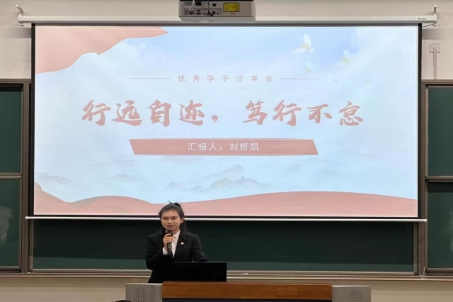 接着,刘哲凯学姐以“行远自迩,笃行不怠”为主题展开分享,她表示大学生应努力践行所学知识,做到知行合一、决不懈怠。作为学生干部,更应充分发挥学生干部在工作、学习中的带头作用,尽职尽责、高标准地要求自己,通过服务他人,能感受到付出的快乐,提升自己的社会责任感。最后,她祝各位学弟学妹们可以在今后的学习生活中取得理想的成绩,大胆地选择、大胆地爱、大胆地生活!