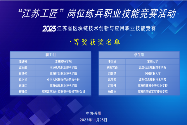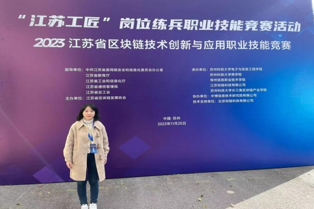 2023年11月25日上午,“江苏工匠”岗位练兵职业技能竞赛——2023年江苏省区块链技术创新与应用职业技能竞赛在苏州圆满落幕,来自省内院校、企事业单位的总计2000余人参加了本次竞赛。经过市赛选拔,我校孟秋彤老师进入决赛,最终以职工组第二名的成绩获得本次竞赛的一等奖,并被授予“江苏省五一创新能手”称号、“江苏省技术能手”称号,同时,开云手机官方版页面登录入口被授予优秀组织奖。