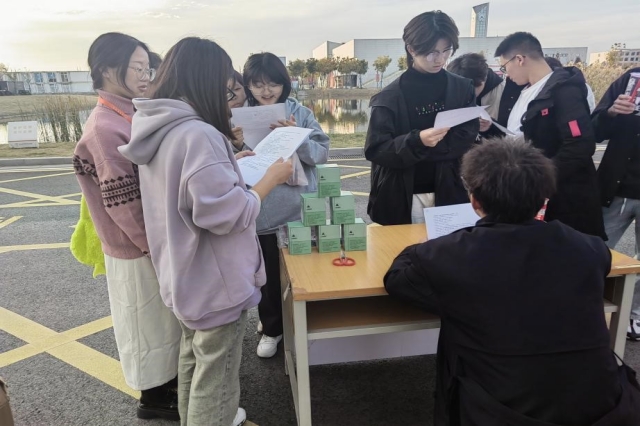 下午4点,竞赛答题的现场宛如一座思维的战场,在宿舍楼下,金黄的夕阳投下温暖的光辉,为竞技的舞台披上一层神秘而庄重的外衣。在答题的过程中,同学们头脑风暴般的思维碰撞,仿佛点燃了智慧的火花。有人认真思考着每一个问题,有人快速书写着每一个答案,现场弥漫着浓厚的法治氛围。天空逐渐失去了白昼的色彩,暮色弥漫而至。金黄的太阳渐行渐远,将余晖撒在西边的云层上,点缀出一片橙红的晚霞。随着太阳的沉没,天空变得愈发深邃,星星悄然点亮了黑夜的帷幕。同学们拿出手机打开手电筒为答题的同学照亮题目,展现了人文社科系独特的人文情怀。答题结束后,为同学们赠送礼品,礼品不仅是奖励,更是对学子们智慧和努力的认可,使整个竞答现场充满了渴望和热情。