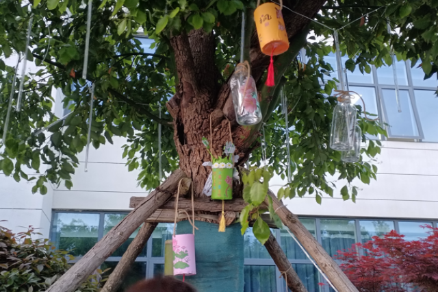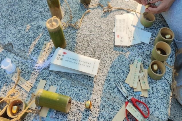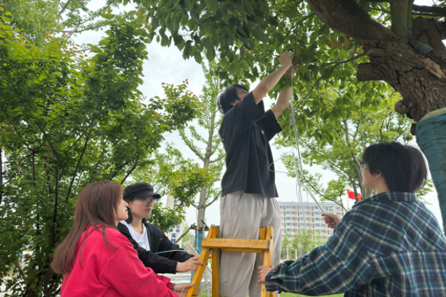 以诗词画卷为依,呈多彩校园。人文社科系环境艺术设计专业的同学们带领着大家一起集思广益,合理规划设计,将这些精美的手工艺品放置在校园的各个角落,共同构筑了一幅栩栩如生的校园文化画卷。飞花令灯笼、竹筒风铃、彩色飞花令牌等作品,如同春天的花朵般点缀着校园,为校园的每个角落带来了生机与活力。随着微风轻拂,竹筒风铃悦耳的声音,飞花令灯笼摇曳的身姿,飞花令牌舞动的诗意,无一不在诉说着诗词的韵味和魅力。每一处风景都如同一首优美的诗篇,让人流连忘返,沉醉其中。