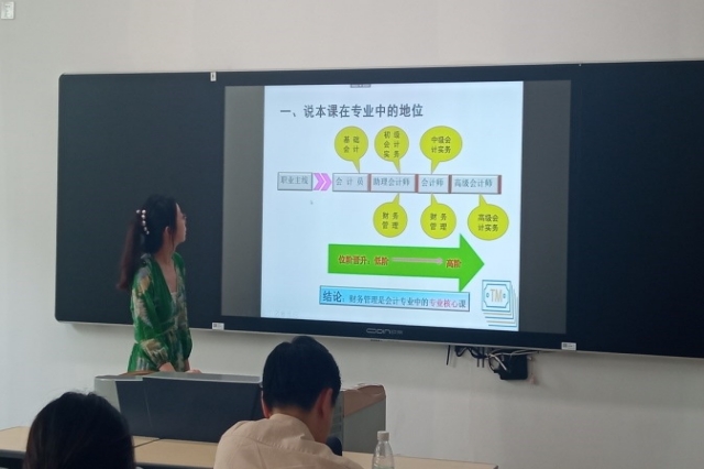 首先,王诗雅老师对《财务管理》课程的教学设计进行了汇报。她围绕课程的定位、课程教学目标、教学内容、教学内容和重难点、教学方法和手段、课程考核方式和教学反思等多个维度对所授课程作了分析和阐述。吴卓然老师对《经济法基础》进行了课程设计汇报,针对学生抗拒理论知识记忆等问题,通过联系学生日常生活和引入经典案例等方法来加深学生对于重难点知识的理解和记忆。王丽颖老师对《智慧化税费核算与管理》进行了课程设计汇报,认为对学生学习积极性不足等问题,采取以微课、动画设计相应教学项目的方式来加强学生学习的积极性。刘俊老师对《金融科技概论》进行了课程设计汇报,将课程内容与学生专业证书的考试内容相结合,以帮助学生加深理解与记忆。此外,薛蓓蓓和孟秋彤老师分别对本学期承担的《会计基础与实务》《证券投资分析》课程进行了课程设计的汇报。