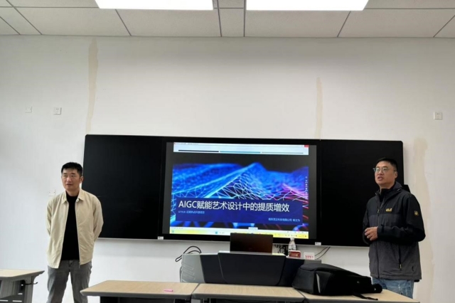 首先,杨立为经理对AIGC技术的起源、发展历程以及当前技术现状进行了简要介绍。同时,杨经理指出利用AIGC赋能艺术设计具有几个显著优势:其一,提升设计效率。AIGC技术能大幅提高设计效率,使设计师从繁琐的底层工作中解脱出来,将更多精力投入到创意策划和方案优化上。其二,拓展设计创意。AIGC能够打破人类固有思维定式的束缚,通过随机组合、跨领域迁移等方式激发更多元、更新颖的创意火花,有效拓展设计边界。其三,实现个性化设计。AIGC可依据不同用户的特征和需求,迅速生成个性化的设计方案,推动艺术设计向差异化、精准化发展。随后,他分享了一些AIGC在艺术设计中的实际应用案例,并现场演示了AI生成的步骤和效果。