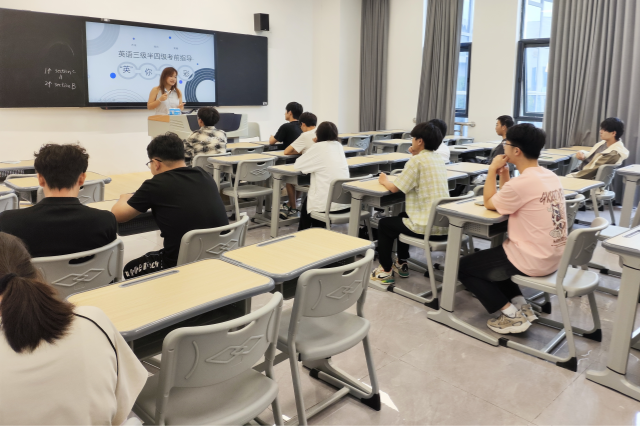 针对三级B/四级考试,杜灿灿同学分模块梳理考点:听力部分标注“建议类句型(Why not...)”高频出题点,阅读板块演示“关键词定位法”,写作环节发放自制“万能句型手卡”(含“It's undeniable that...”等模板),翻译部分汇总“二十四节气”等固定译法。她边讲解边投影近三年真题规律,着重强调“四级写作需在40分钟内完成三段式结构”,台下学生纷纷用手机拍摄课件重点。