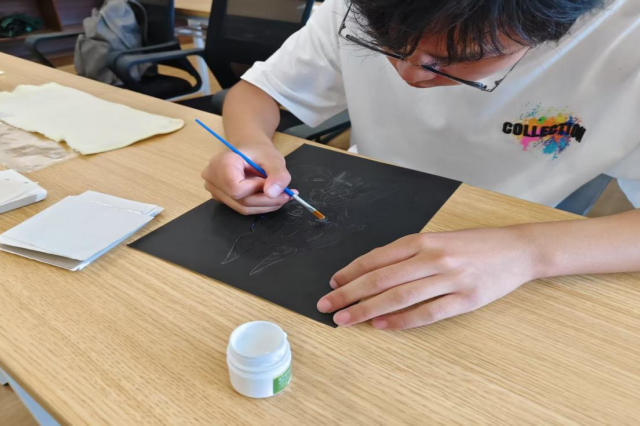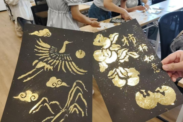 在实操环节,学生们手持镊子完成金箔裁剪、粘贴等精细操作,将薄如蝉翼的金箔转化为书签、贺卡等创意作品。视觉传达设计专业学生刘同学在作品分享中提到:“当金箔在卡纸上拼贴出‘知行合一’的校训时,突然理解了传统工艺与现代设计结合的魅力。”