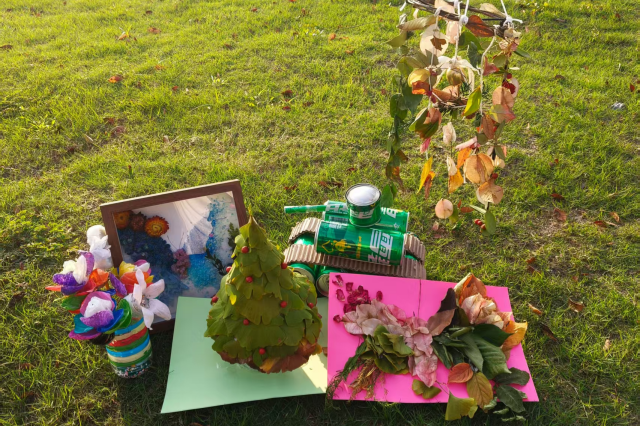 活动伊始,学生干部们化身“自然拾荒者”,在校园角落收集银杏叶、梧桐叶等落叶,回收塑料瓶、旧纸板等废弃材料。制作现场,大家分工协作:裁剪、拼接、粘贴、上色,每道工序都细致打磨。干枯的落叶经修剪拼贴成栩栩如生的秋日风景画,废弃塑料瓶缠绕丝带化作别致的装饰品和小坦克,原本的“无用之物”在巧手下焕发新生。