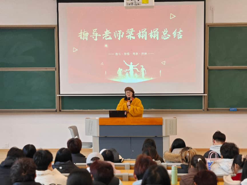 活动尾声,人文社科系学生会指导老师梁娟娟作总结讲话。她首先肯定了先进班集体强大的凝聚力与榜样的示范引领作用,同时高度赞扬了优秀学长学姐们发挥的传帮带作用。本次分享会成功搭建了交流互鉴的平台,让奋斗与协作的理念深入人心。强调班集体建设离不开每一位成员的主动付出,榜样的成长之路更需要持之以恒的沉淀与积累。最后,希望同学们以优秀班集体为标杆、以榜样为灯塔,将本次分享的经验转化为脚踏实地的行动,深耕专业领域、勇毅逐梦前行,不负韶华与时代重托。
