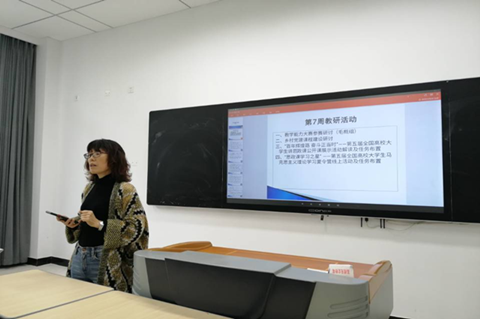 会议伊始,陈璐璐老师汇报了教学能力大赛参赛的准备情况,就“教学实施报告”部分作重点汇报,针对存在的问题及存在的困惑,思政中心教研团队进行了认真热烈地研讨:一是报告撰写的语言要凝练,不要冗长啰嗦;二是针对实施报告第三部分“教学实施成效”要以其中某一课时为例;三是要有创新点。