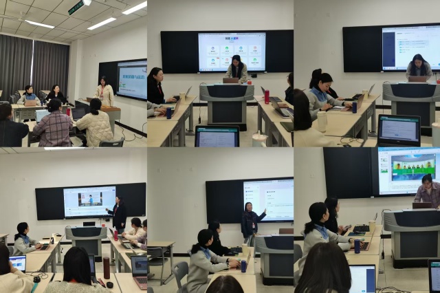 随后,老师们分进行实操演练,依托有言平台体验智能化课程视频的生成过程,尝试使用AI工具优化教学资源。实操过程中,老师们相互交流操作技巧,针对AI工具使用中遇到的问题共同探讨解决方案,切实感受到AI技术为课堂教学带来的便捷与创新。