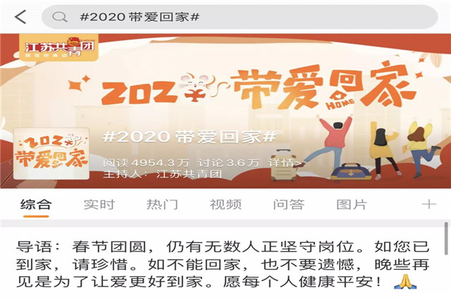 为引导团员青年通过文字、摄影创作的方式,真实记录家乡年味,传递温馨过春节、文明过春节、节俭过春节、平安过春节、和谐过春节的欢乐。2020年1月20日-2月13日,学院团委响应江苏共青团的号召,面向学院全体2018级、2019级团支部,开展了关于#2020带爱回家#的网络倡议活动,活动形式为发布微博,紧扣“为父母准备的一份礼物、为父母做的一道菜、和父母一起拍的全家福或节俭过春节的好点子”等主题,充分展现浓浓的中国年味。各系部团总支响应学院团委的号召,积极的在微博上发布话题,将爱传递。