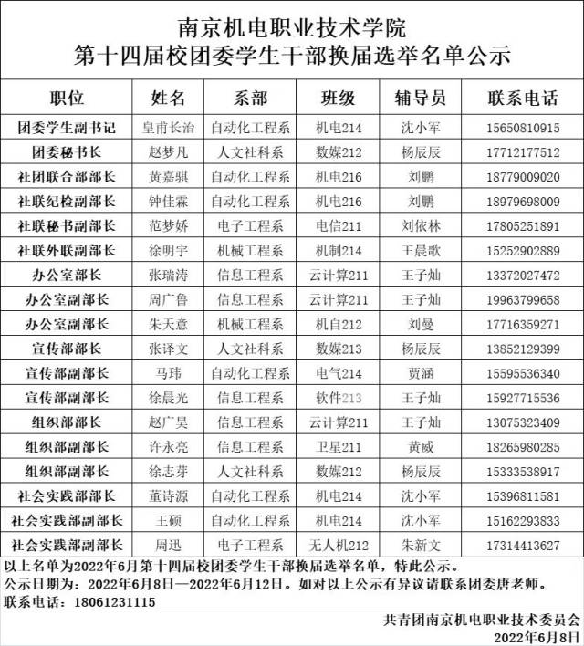 为切实加强学生干部队伍建设,本着“公平、公正、公开”的原则,进行了开云手机官方版页面登录入口2022-2023学年学生干部换届选举工作,通过学生自主报名、组织推荐、资格审查、竞选答辩、综合考察等环节,选拔产生了拟任人选,为提高学生干部选拔的透明度,现将拟任人选的名单予以公示。