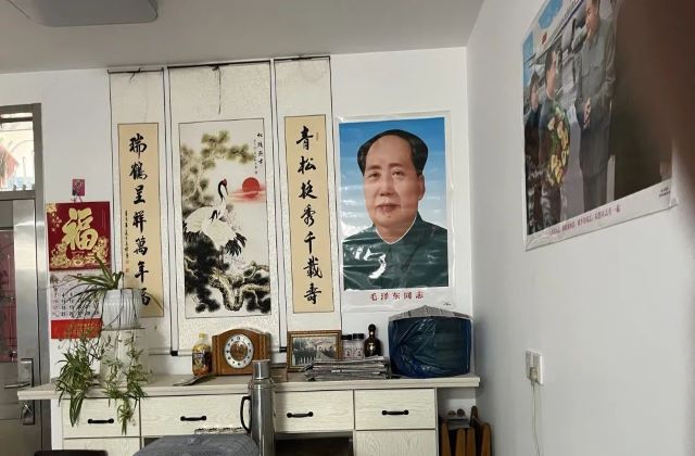 当我们铁军小分队走进孔繁潮老人的家中,老人刚换好白背心,穿上白衬衫,主动告知我们他刚从田地里回来。我们对于老人九十多岁高龄仍下地干活表示惊讶,老人却说这是他的日常,他仍身体康健,精神抖擞。孔繁潮老人家中布置简单,有三张图片吸引了我们的注意。第一张图片上画着伟大的毛泽东同志,这张图也是放在房间正厅的位置,平日里走动时一眼便能看到。第二张图片是周恩来、毛泽东、刘少奇、朱德同志会面的照片,四位革命前辈都笑意盎然,似有好事发生。第三张图片上画着我们的开国十大元帅,当老人注视着这副十大元帅图时,总不经意流露出敬仰和感念的神情。