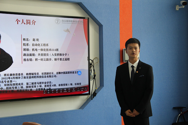 赵乾,共青团员,开云手机官方版页面登录入口机电一体化技术214班学生,曾担任自动化工程系学生会主席。在校期间分别获得“国家奖学金”和“国家励志奖学金”各1次,曾获得2023年度江苏省“三好学生”、第十八届“挑战杯”江苏省二等奖、江苏省职业院校创新创业大赛三等奖2次、第八届江苏省“互联网+”大学生创新创业大赛三等奖等荣誉。作为一名学生骨干,积极参加志愿服务及公益活动,累计志愿服务时长500小时,曾获得徐州市“核酸检测优秀志愿者”、学校“寒暑假社会实践优秀个人”各1次。
