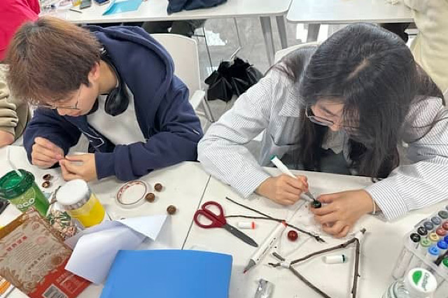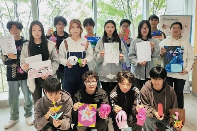 活动现场,星梦馆209内部热闹非凡,人头攒动,充满了青春的气息。来自不同年级、不同专业的同学们齐聚一堂,热情高涨,纷纷投入到制作飞花令作品的创意海洋中。他们各显神通,巧妙利用各种材料和工具,将一块块普通的材料化作一件件精美的艺术品。有的同学将古诗中的意象融入到作品的设计中。有的同学选择用剪纸的方式表现诗句中的意境。每个人的脸上都洋溢着灵动和喜悦的光芒,现场洋溢着欢声笑语,充满了活力四溢的氛围。