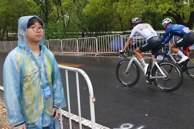 赛道沿线,每隔一段距离就有身着鲜艳志愿服的同学们挺立坚守。于赛前清理赛道上的障碍。保持赛道封闭,如遇摔车等突发状况,及时通知取得救援。即使面对台风的侵袭,也依然用双手扶住赛道两旁的护栏,防止倒塌砸伤高速行驶中的运动员。在终点区域,志愿者们的热情与风雨形成鲜明对比。他们呐喊助威,为冲刺的运动员送上最炽热的欢呼。