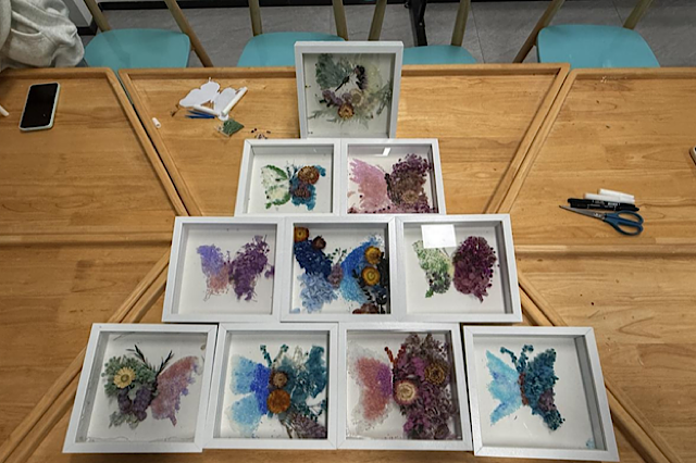 “把秋天里的干花做成蝴蝶,像留住了春天的翅膀”,参与活动的同学笑着分享创作感受。活动尾声,十余幅干花蝴蝶相框作品整齐陈列,蝶翼间的花屑与未收整的工具,成了这场秋日创意聚会的生动注脚。