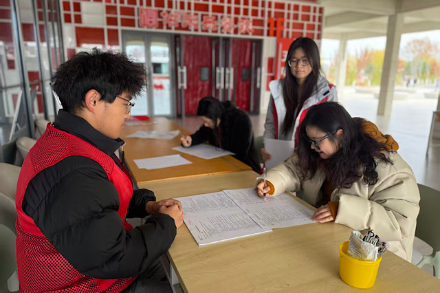 冬日微风虽带凉意,献血现场却暖意融融、秩序井然。活动现场,医护人员熟练地准备采血物资,同时简明讲解献血注意事项;志愿者们化身“暖心向导”,提前在休息区备好热茶、能量饼干,方便师生献血后及时补充体力,细心为有需要的师生搬来休息座椅,贴心又周到。遇到紧张的同学,便轻声讲解献血常识、分享恢复技巧;全程带着微笑,始终耐心温和,用笑容为师生驱散不安,传递暖心力量,让整个献血过程既高效又暖心。