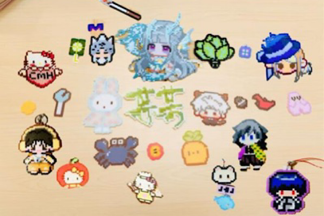 活动现场的“跨圈IP作品矩阵”格外吸睛:既有《王者荣耀》西施“游龙清影”皮肤(蓝白渐变豆粒还原飘逸长发),也有小说《某某》的“梧桐叶”装饰(豆粒密度复刻纹路细节),还有《恋与深空》秦彻Q版形象(深灰+黑棕豆粒凸显发型层次)、《鬼灭之刃》富冈义勇的“水柱”形象(以蓝黑主色调搭配羽织纹样),以及融入个人缩写的Hello Kitty定制钥匙扣。这些作品里,最小的Hello Kitty仅用20余颗豆粒,最大的西施形象则耗费超300颗豆粒,此次活动耗时近6小时完成。