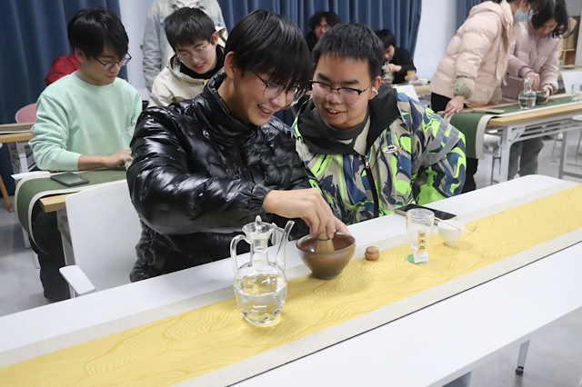 茶筅搅动间,细腻的白色茶沫缓缓升起,与同学们专注的神情相映成趣。现场不时响起阵阵惊叹,讨论技法的交流声此起彼伏,大家在调膏、击拂的每一个步骤中,既考验着专注力与动手能力,也在协作中凝聚着默契,成为校园里一道雅致动人的风景。