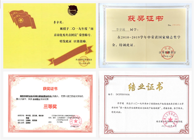 入学以来,先后荣获国家奖学金、国家励志奖学金,南京市优秀共青团员,中英STEAM创新大赛一等奖和最佳创意奖,中美青年创客大赛(南京赛区)三等奖、入围北京总决赛,江苏省第十届大学生机器人大赛三等奖,学院“优秀共青团员”、“三好学生”、职业规划三等奖。