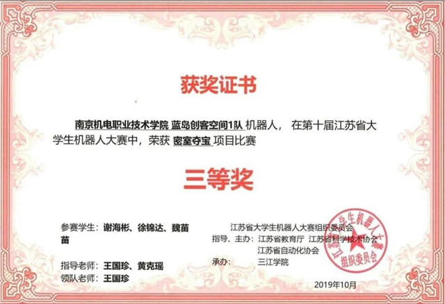 我深知仅仅是书本上的知识还远远不够, 从大一担任班级班长,到大二的学生会外联部部长兼班级班长兼任国旗护卫队队长,我一直身兼数职,体会着工作学习两不误的艰辛。学院组织及社团是我学习、锻炼能力及服务他人的第二课堂,是我开拓视野的新天地。在学生会中,我抓住一切机会给大家和自己提供更多的锻炼自身的能力,组织学生会成员积极参加学院的活动,为学院和系部增光添彩。作为社团的一员,除了把自己的专业学好之外,也要跟双创班里的同学一起合作完成项目、参加专业类知识技能竞赛并夺得奖项。我参加了江苏省大学生机器人大赛,为了能够更好地准备比赛,取得满意的成,大家分工合作,各自准备自己的模块。遇到难以解决的问题,我们会一起进行讨论。在我们的不懈努力下,最终夺得了江苏省大学生机器人大赛“密室夺宝”项目三等奖。