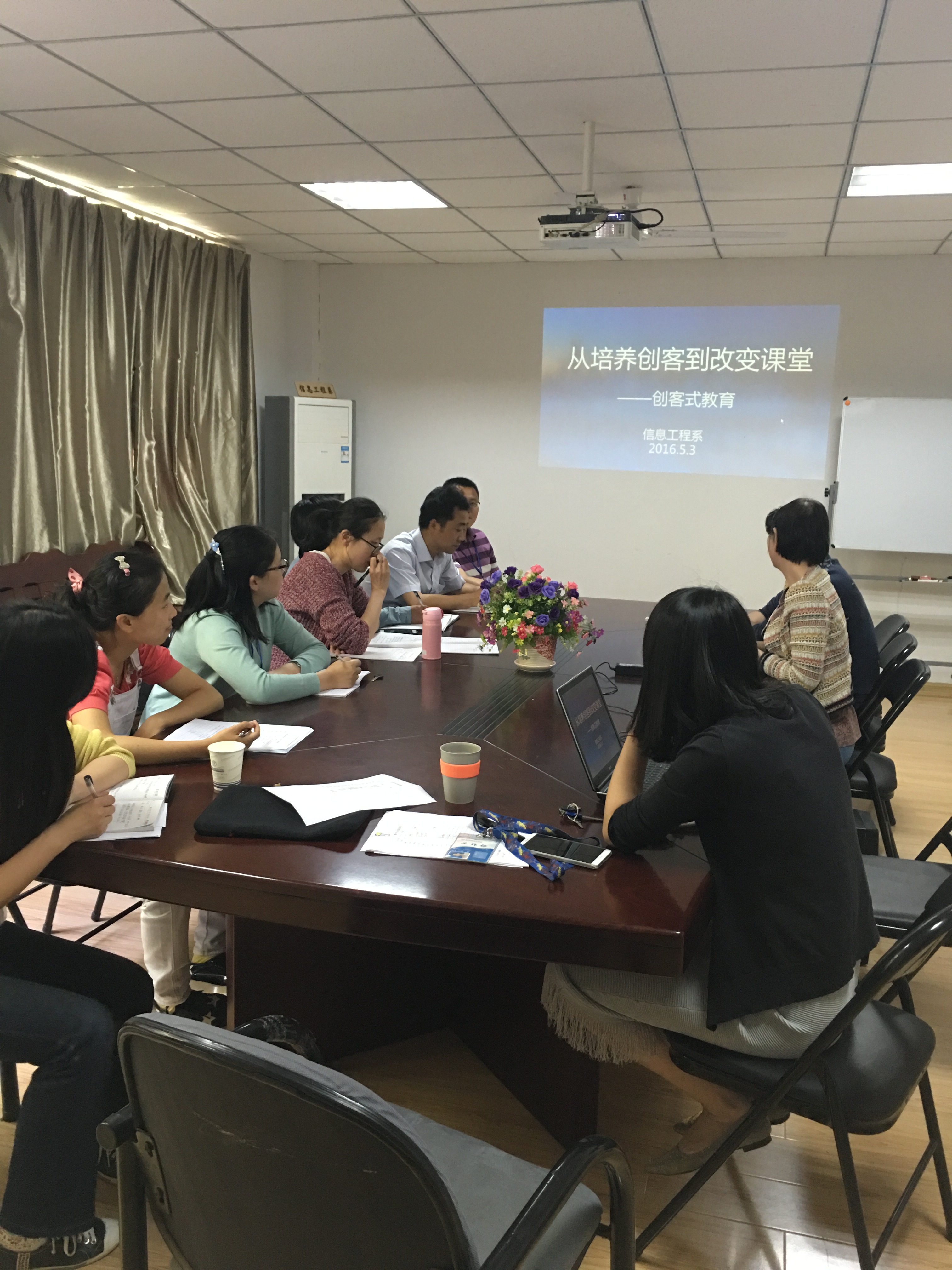 创客与教学的结合是多方面的,5月信息工程系的教研活动将围绕着这一思路开展一个主题研讨月活动。5月3日下午,系部全体教师共同参加了第一次研讨活动,由刘娴老师主持的关于创客式课程教学探索的研讨。