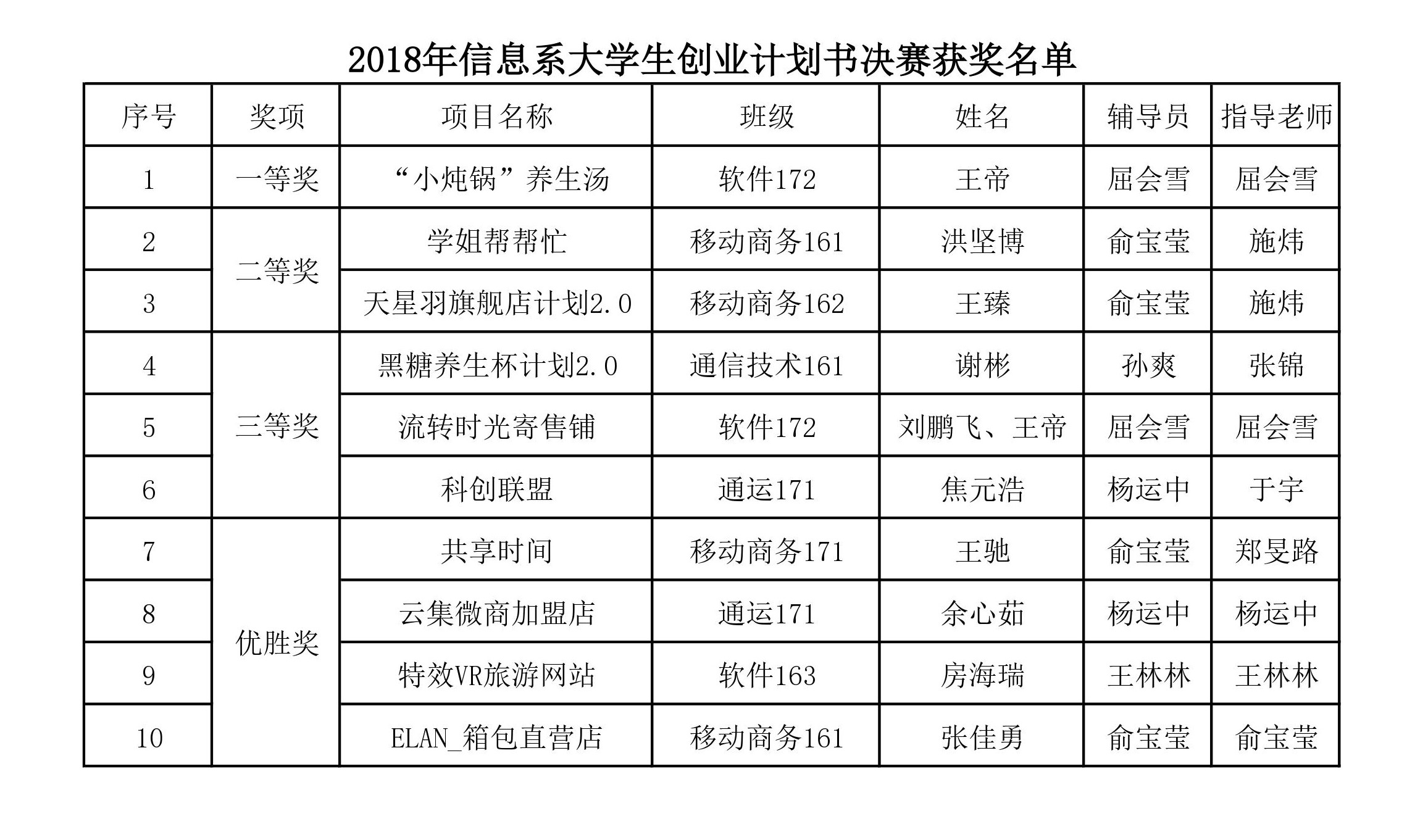 为促进大学生的创新、创业活动的开展,拓展素质教育,提高学生的综合素质,推动大学生社会实践活动的发展。2018年4月23日,信息工程系大学生创业计划书大赛系部决赛在系部会议室举行。信息工程系主任王玮、信息工程系书记胡枫、系办主任张锦、学工处老师顾窗林、专业教师郑旻璐等担任评委。