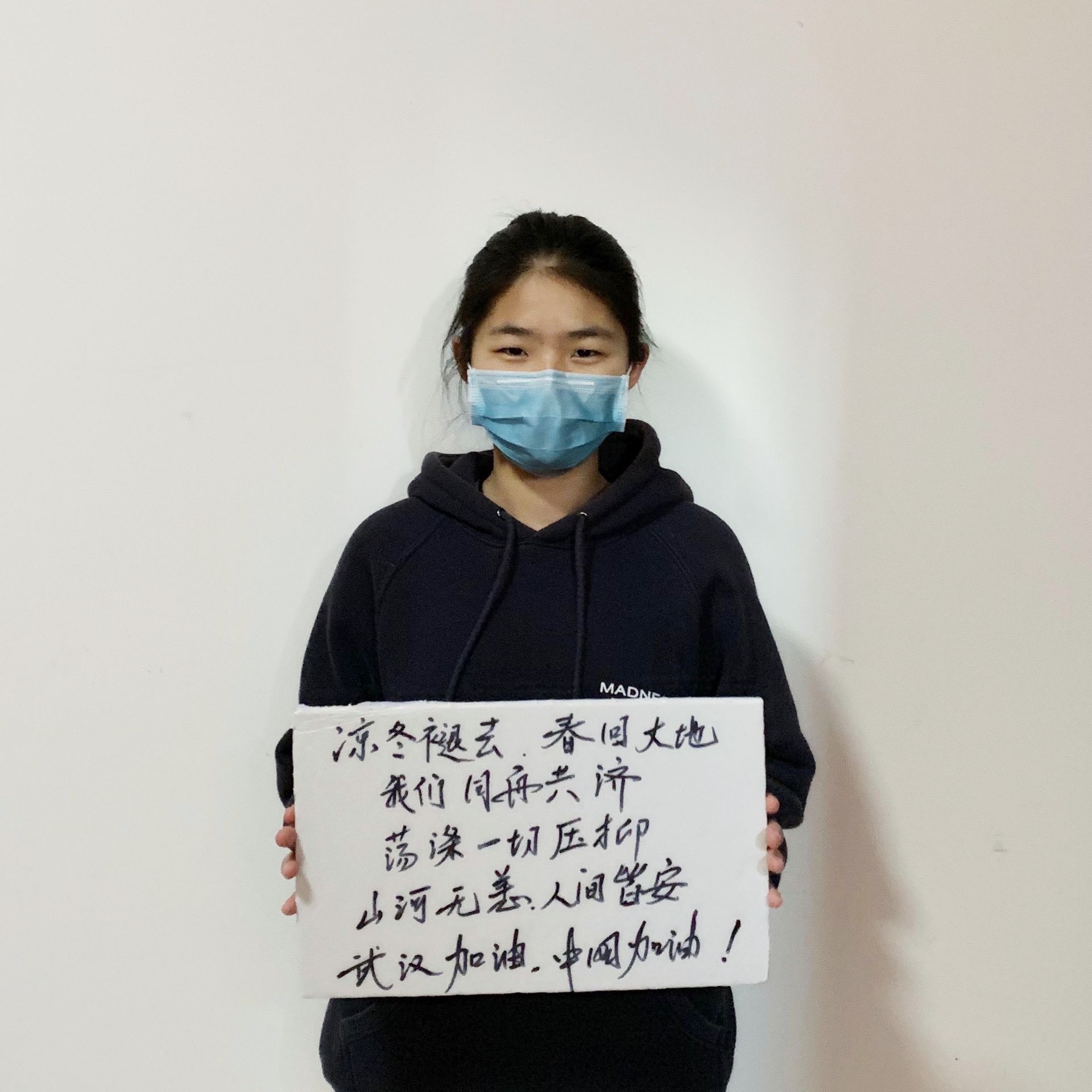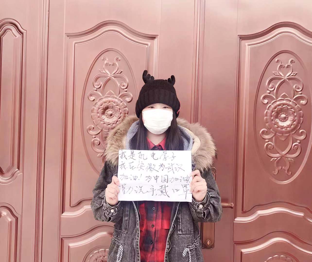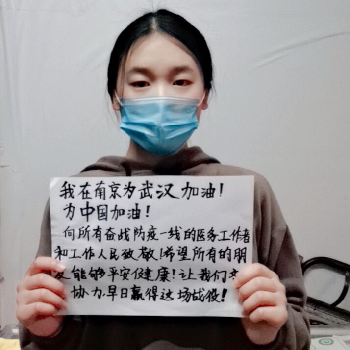 通信191班团支书宫瑞棋:我在江苏南京为武汉加油!为中国加油!向所有奋战防疫一线的医务工作者和工作人员致敬!希望所有的朋友能够平安健康!让我们齐心协力早日赢得这场战役!