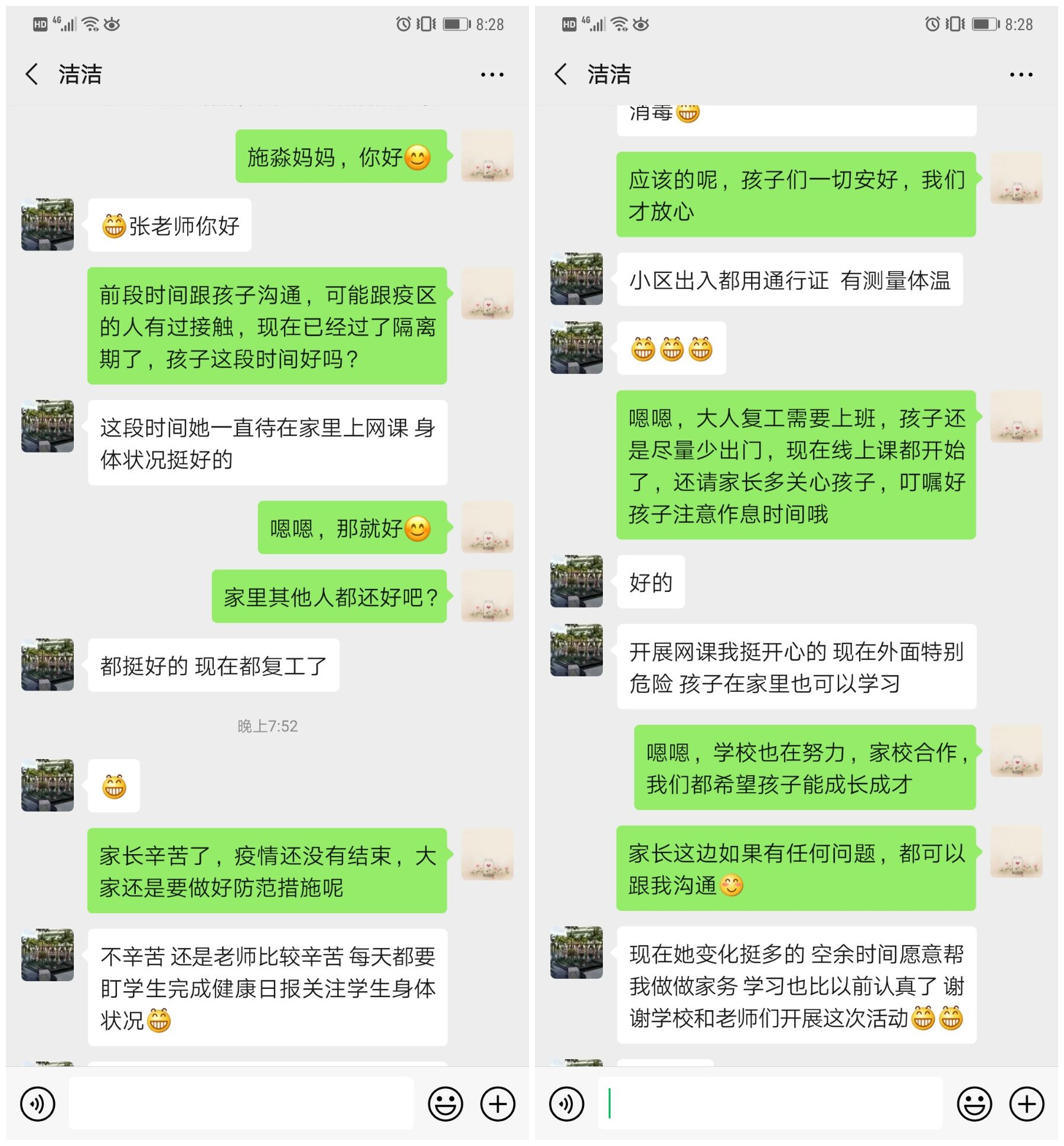 这样的家校共同守护的故事还有很多,还在继续。每一份守护的背后,都是我们铭记于心的 为人师表的责任,兢兢业业的工作,倾尽全部心血。没有冬天不可逾越,没有春天不会来临。我们坚信,此行有你我,就有赢得任何战役的底气和力量。心与心的牵挂,情与情的交流,家校同守护,必能打赢这场疫情防控阻击战!