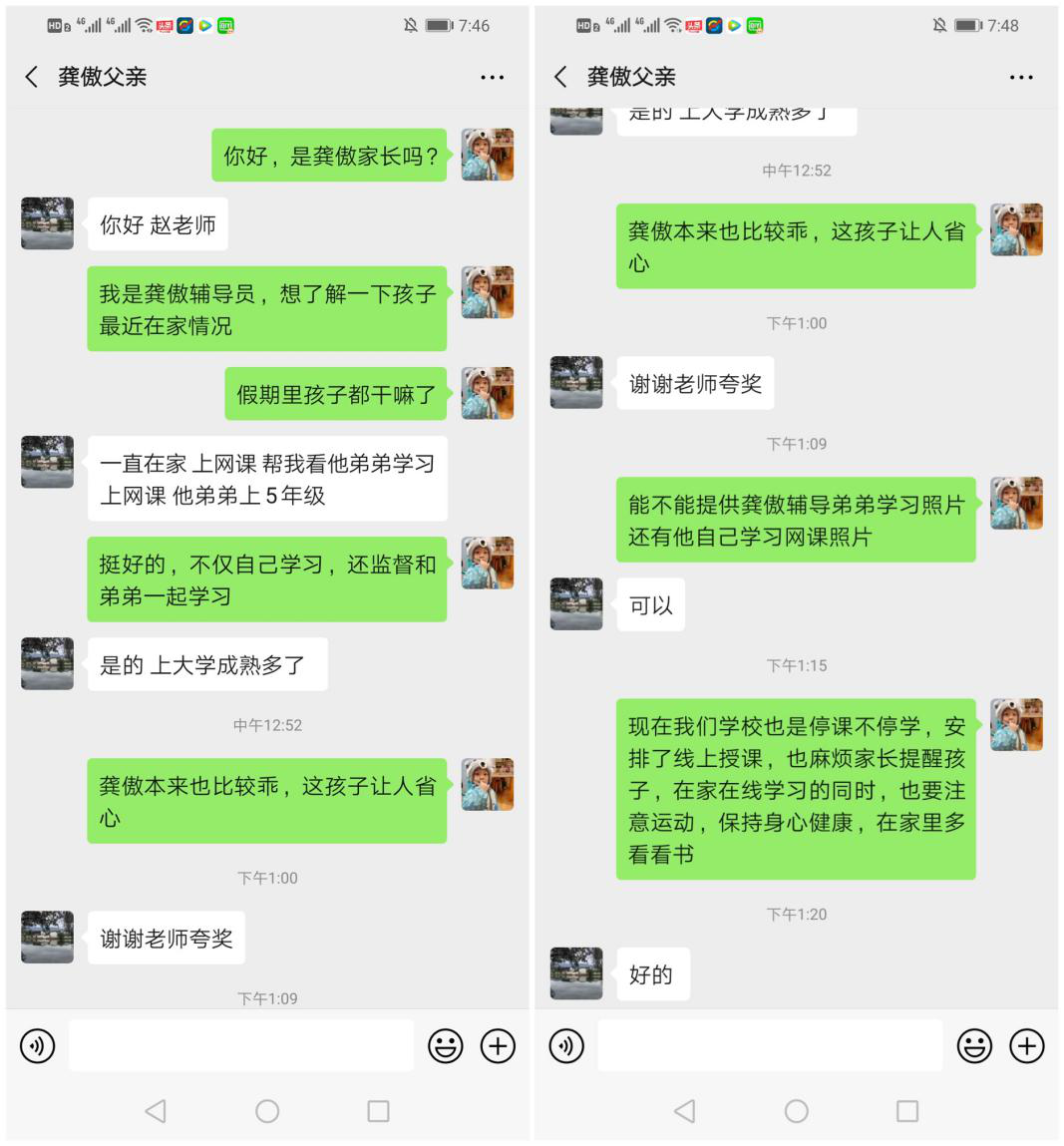 待在家里不出门,就是为社会做贡献。但身为学子绝不可学习“流量时代的网红”,吃了睡,睡了吃,要做自我规划使每天过的充实,在家自我隔离期间,龚傲每天坚持品读经典,按时学习,锻炼自我,帮忙家人清扫卫生,帮助家人做饭,照看年幼的弟弟,中小学网课开课之后,便帮弟弟调整学习设备,辅导弟弟功课,与弟弟共同学习,为弟弟树立榜样,让家里有个良好的学习氛围,即使处于特殊阶段也能收获满满。