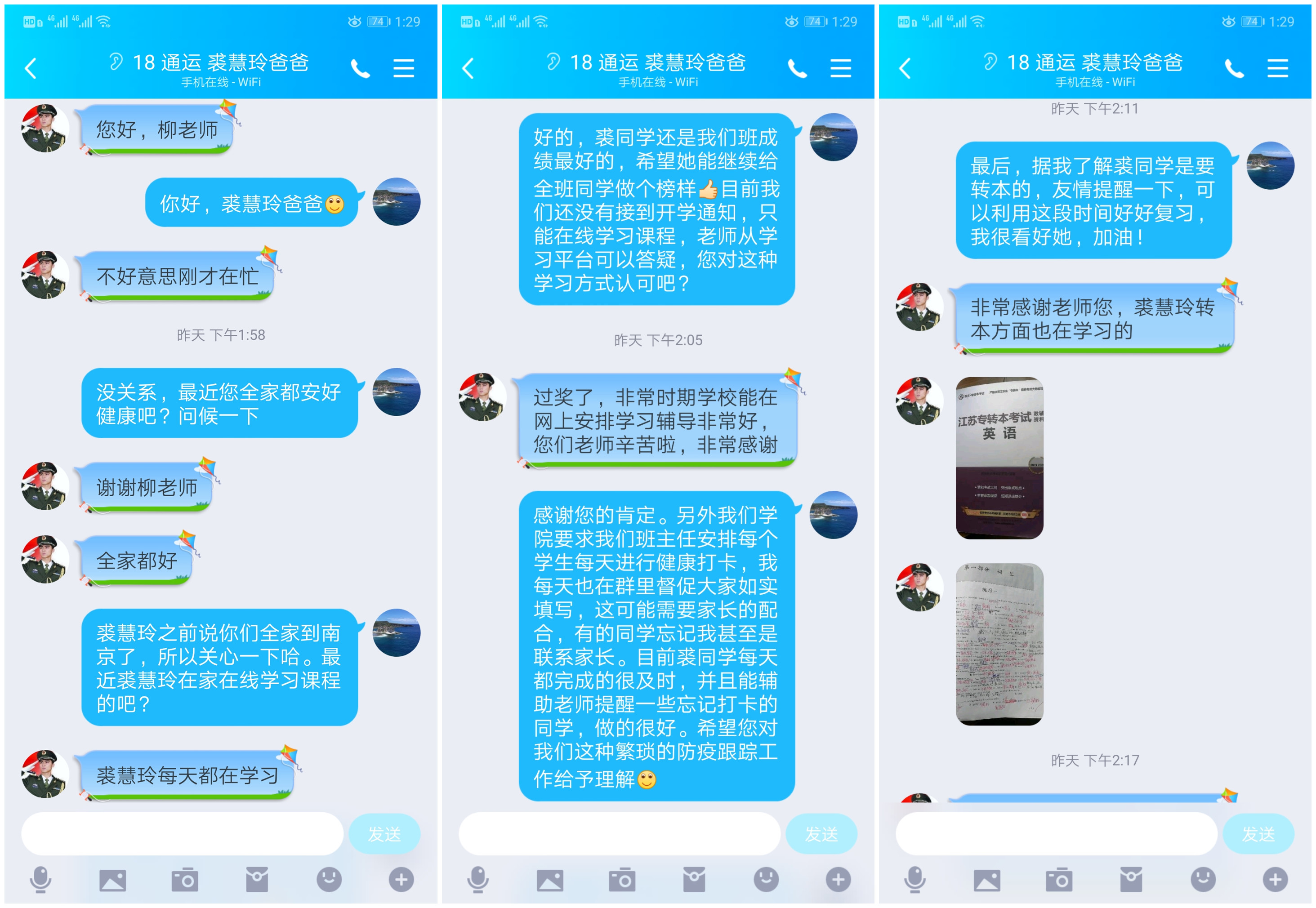 在这个不一样的假期里,面对学生作息时间混乱、假期超长易松弛失去了自控力等问题,通信系统运行管理182班辅导员柳亚婷每日提醒学生每天坚持学习打卡,在线上教学平台及时查看跟进他们的学习情况并进行督促,并挑选成绩全班第一、全专业第一、担任副班长的裘慧玲同学,作为学习标兵在群里进行宣讲,给大家树立正面的榜样。该同学1月19日回浙江省东阳市虎鹿镇仙芝陵村过年,2月9日回到江苏省南京市建邺区南苑街道爱达花园,至今仍旧保持居家隔离的状态,但全程始终坚持学习,积极应对,为转本打好基础。在和家长的沟通中,家长对学院防疫工作也表示大力支持,并对非常时期这种在线学习的方式表示认可。