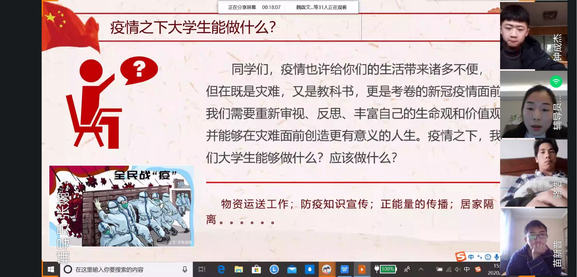 为开好此次主题班会,辅导员们精心准备、详细查阅相关资料,认真组织策划,重点围绕“讲抗疫故事、学防疫知识、守共同家园”的主线,通过交流全国抗击疫情情况,让同学们感受中国速度、中国规模、中国效率,进一步增强民族自豪感;介绍“一省包一市”对口支援策略,让同学们体会我国社会主义的制度优势,进一步增添抗疫必胜的信心;讲述白衣天使的勇敢逆行故事,传递了人间大爱,让同学们明白什么是奉献和担当,进一步提高责任意识。