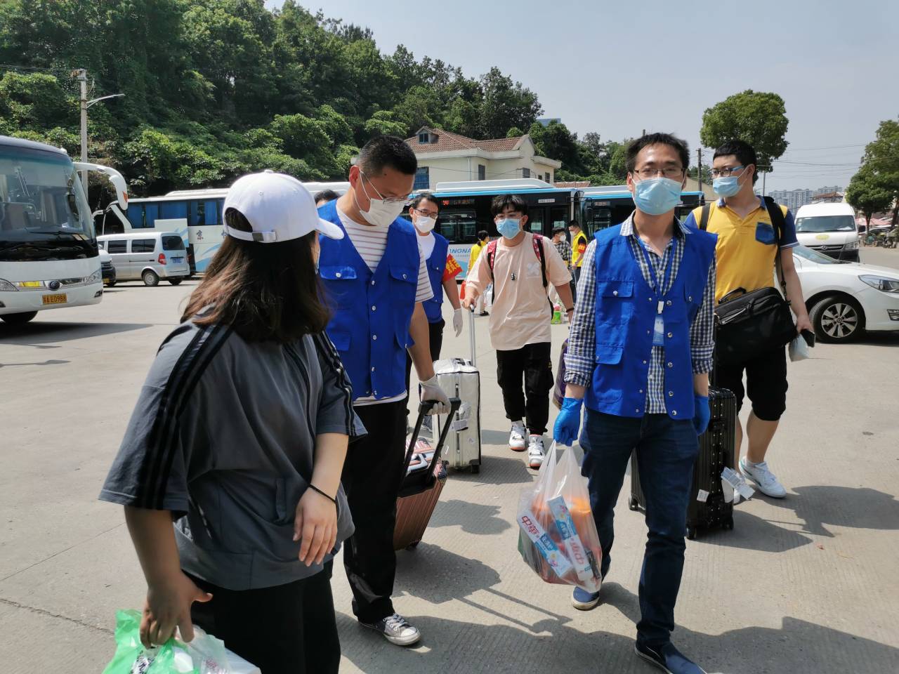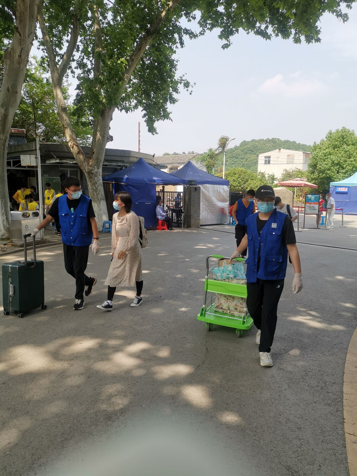 校门口测完体温、刷完绿色的健康码后,校园内的志愿者赶紧接过学生的行李。