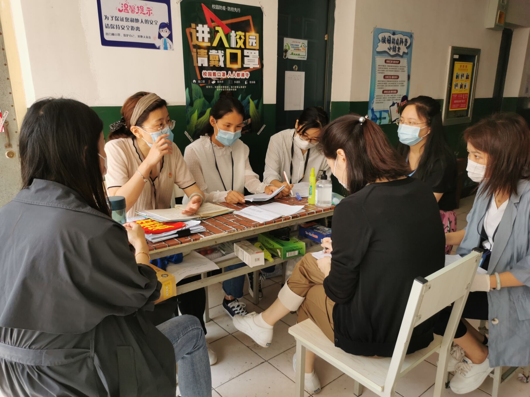 辅导员值班现场布置工作: 详细任务分解: 日夜坚守的老师: 带学生去就餐: 定时测温: 关心学生、嘱咐学生: 为了帮助学生调整好心态,尽快适应校园学习生活,QQ班级群成为主战线,辅导员24小时在线,积极宣传科学防疫知识。提醒同学戴口罩、勤洗手、常通风,不扎堆,增强防护意识,严格落实晨、午、晚检制度、日报制度、就餐制度、线上教学制度等,同时还利用网络,密切关注学生心理动态。