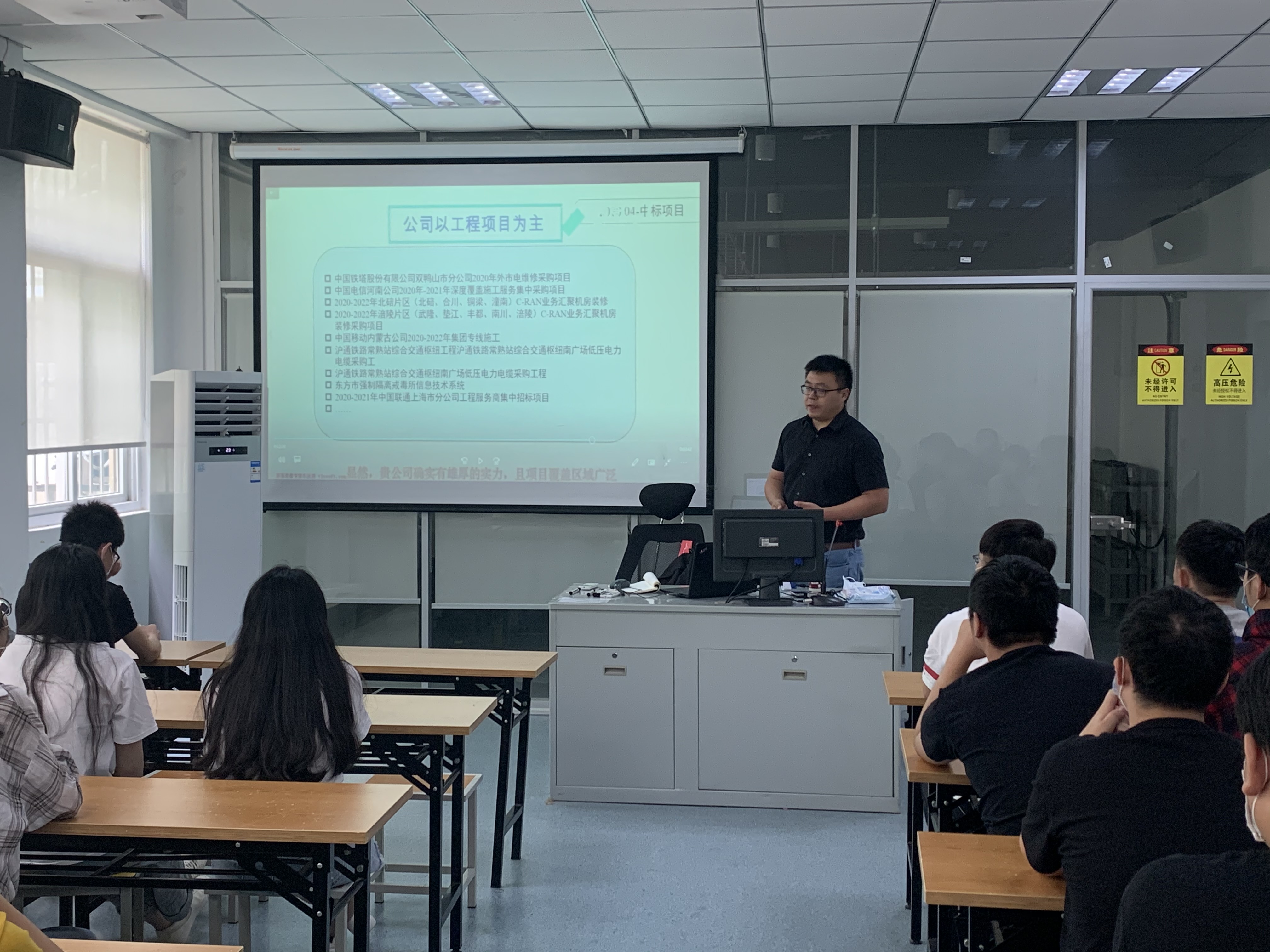 王海飞经理给大家介绍了通信行业的各个岗位所对应的工作内容以及各类要求。王经理作为通信行业的专家级工程师,以自身的工作经历和,勤能补拙,嘱咐各位同学在岗位上要有吃苦耐劳的精神,要有大局观念和全局视角。并且要对自己的职业目标和职业规划非常清晰。