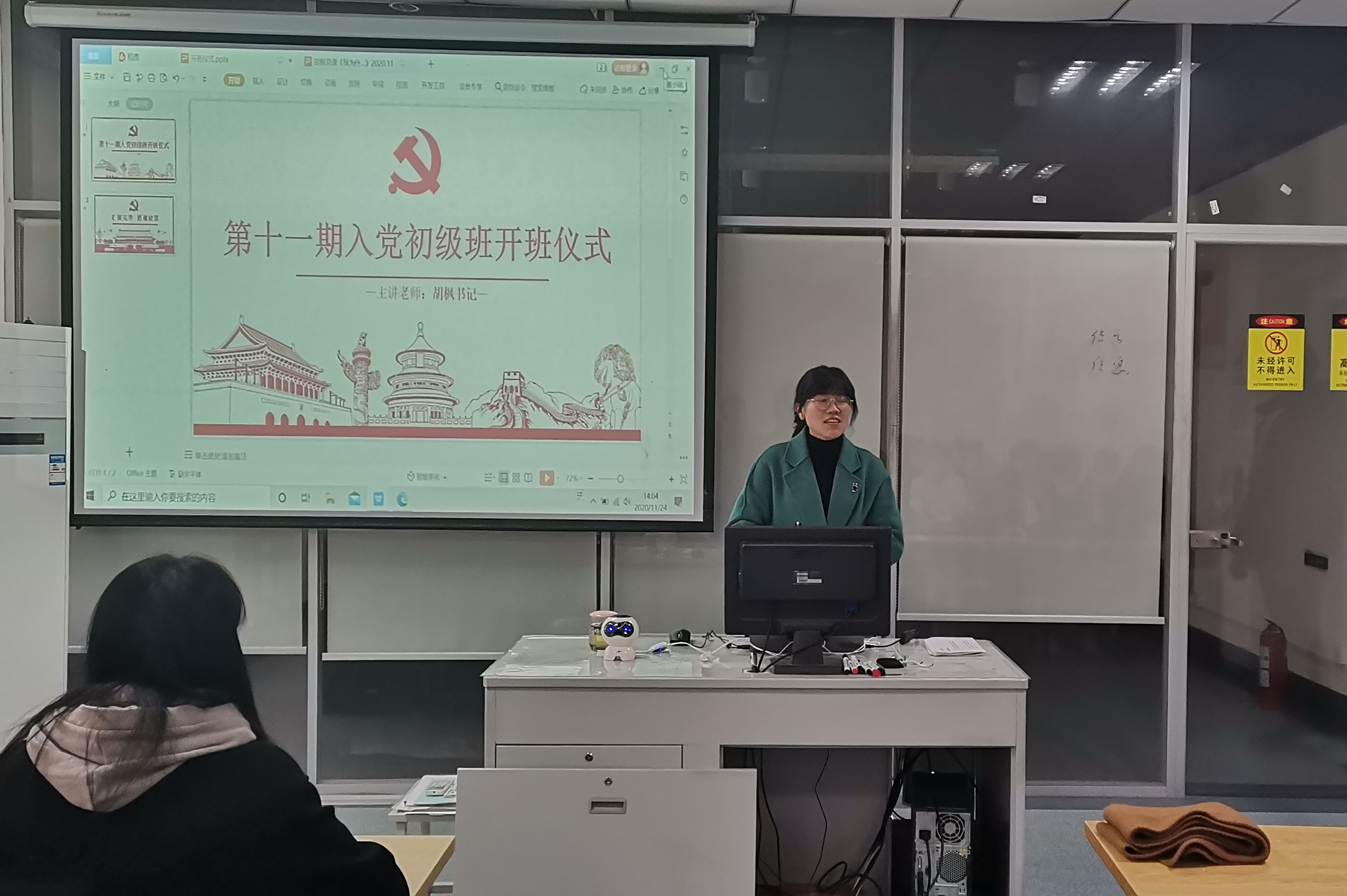 会议由团总支书记于宇老师主持,伴随着国歌的奏响,第十一期初级党课班开班典礼正式拉开帷幕。首先由胡枫老师讲话,她对同学们提出了三个要求:"实学、实求、实干”。并且为大家制定了党课初级班的签到和上课要求。