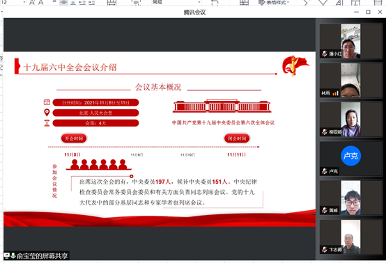 本次学习由支部组织委员俞宝莹同志主讲,她给大家带来了“深入解读十九届六中全会精神”的主题讲座。俞宝莹同志首先给大家介绍了十九届六中全会的召开时间、参会人员、主要议程等基本情况。