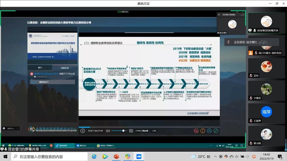 2022年4月19日下午,软件教研室全体老师再次相聚于云端,在教学副主任刘娴的带领下,老师们一起观看学习了全国职业院校技能大赛教学能力比赛经验分享会。