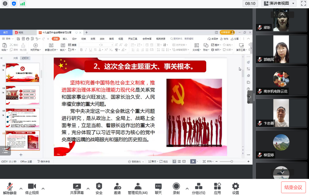 2022年4月26日晚,信息工程系通过腾讯会议召开了“迈向‘中国之治’新境界的重要里程碑——认真学习贯彻党的十九届四中全会精神”的专题学习会议。专题会议由学院党委工作部周启国部长主讲,支部书记吴伟萍、系部主任王玮以及全体系部教职工参加了此次学习活动。