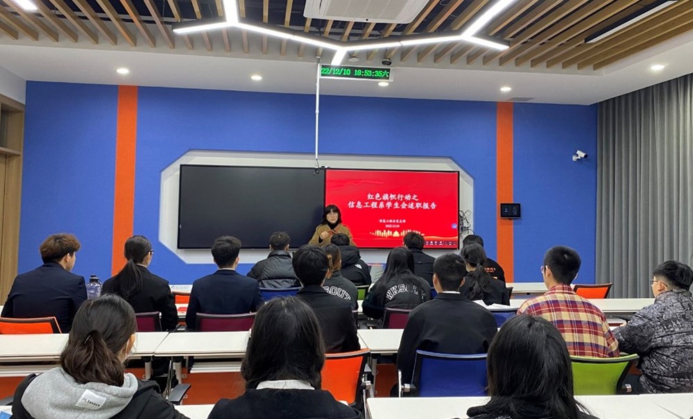我系学生会本学期的各项工作即将结束,为了推动信息工程系学生会工作更好的发展,提高学生会干部的工作热情,我系于2022年12月10日在博学楼410教室举行红色旗帜行动之学生会年度工作总结暨表彰大会。参加本次大会的有系部书记胡枫老师、学工干事郝麒老师、各班辅导员以及学生会全体成员和班长联合会成员。