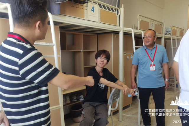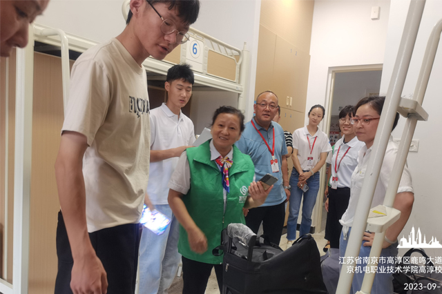 走访中,刘娴副主任对新生表示慰问的同时,还引导大家去了解各自的专业,提前做好学习计划,为大学的学习生活做好准备;胡枫书记倾听了同学们提出的问题,作出了详细的回答,并且针对防诈骗的问题,要求大家提高警惕,保证自己财物的安全;姚小冬主任嘱咐大家要养成良好的作息习惯,共同维护寝室卫生,同时强调大学时光宝贵,尽快调整好个人心态,更好的适应大学生的角色,投入到丰富多彩的大学生活中去,要在实践中提升自我,追求卓越;赵学洪副院长表示,叮嘱大家第一次远离家人一定要照顾好自己,整理好内务,注重个人卫生和宿舍环境卫生,要时刻注意人身财产安全,防盗防诈,调整好心态,合理作息,以饱满的热情投入到南京机电的学习生活中去。
