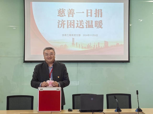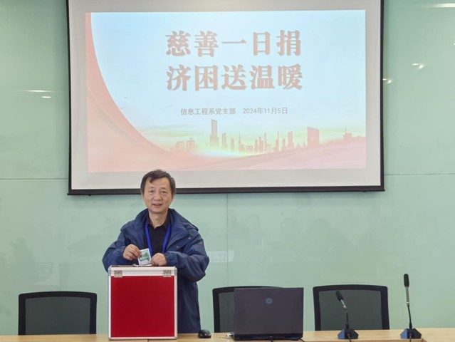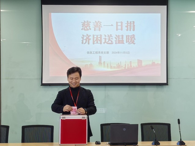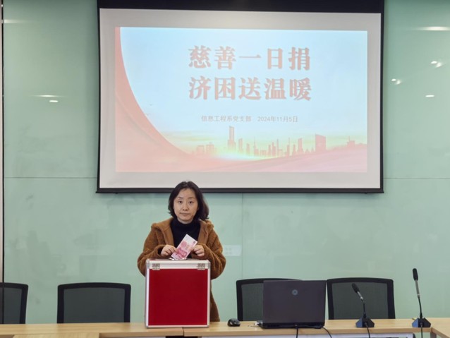为深入贯彻落实党的二十大精神以及习近平总书记关于慈善工作的重要讲话精神,大力弘扬扶贫济困、友爱互助这一中华民族传统美德,信息工程系积极响应南京市开展 2024 年“慈善一日捐、济困送温暖”活动号召,于11 月5日下午在弘德楼西塔602会议室组织开展了“慈善一日捐・济困送温暖”捐款活动。本次活动由党支部书记胡枫主持,信息工程系全体教职工参加。