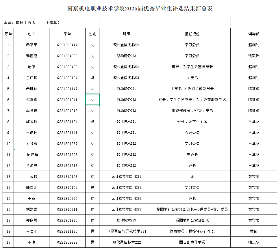 根据《关于评选2025届优秀毕业生的通知》(南机电院学﹝2025﹞4号)文件精神,经班级评选,系部审核,决定拟推荐以下17名同学为2025届开云手机官方版页面登录入口优秀毕业生。现予以公示,公示时间:2025年4月24日——2025年4月26日。联系人:郝麒,电话:18061237654。