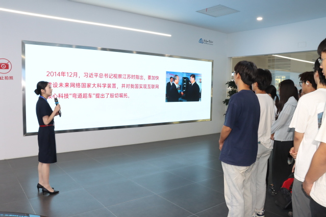 在专业讲解员的引导下,师生们认真聆听每一项技术的原理、应用场景及创新突破点。从超高速大容量光传输技术到新型网络体系架构,从智能计算平台到前沿通信设备,每一项成果都吸引着师生们的目光。当了解到这些前沿技术将在未来深刻改变人们的生活、工作和学习方式时,师生们纷纷发出惊叹。在实验室展厅入口“原始创新、顶天立地、世界一流、不可替代”16字战略定位前,党支部副书记陈雪带领师生回顾实验室发展历程,从2014年习近平总书记视察江苏时对网络安全的关切,到2023年总书记考察实验室时强调 “求实且扎实的创新之路”,生动诠释了科技工作者 “十年磨一剑” 的坚守背后,是党对科技创新事业的坚强领导与精神指引。