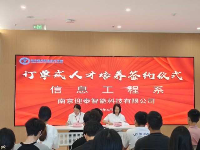 2025年6月10日,南京迎泰智能科技有限公司与信息工程系于弘毅楼一楼学生一站式社区举行订单式人才培养签约仪式。信息工程系党支部副书记陈雪、南京迎泰智能科技人力资源部总经理曹丽雅作为双方代表上台签约,移动商务学生代表共同见证这一重要时刻。此次合作标志着双方在深化产教融合、创新协同育人机制方面迈出实质性步伐,为智能科技领域应用型人才培养注入新动能。