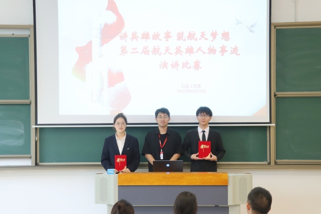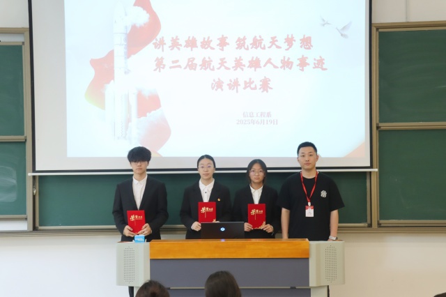 6月20日,信息工程系党支部“讲英雄故事,筑航天梦想”第二届航天英雄人物事迹演讲比赛决赛,在勤学楼102教室圆满收官。此次比赛旨在通过讲述航天英雄故事,激发青年学子的航天梦想与奋斗热情。本次决赛还邀请了信息工程系党支部书记陈雪、学工干事郝麒、卫星通信与导航技术专业负责人黄威、卫星通信与导航技术专业教师卢玉皖担任评委,他们认真聆听每位选手的演讲,并给予了专业而中肯的点评。更多学子在航天英雄精神的感召中汲取奋进力量。