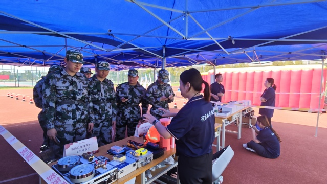 应急装备区:防烟面具的佩戴步骤、消防应急灯的照明范围、逃生绳的承重性能……工作人员通过“现场演示+互动问答”的形式,让学生们了解这些装备在火灾逃生中的关键作用。